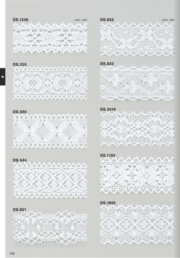 〇シルケット加工済の綿糸を使用したトーションレースで、繊細に編み込んでおります。