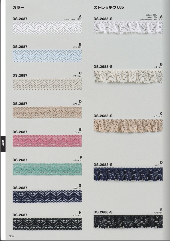 | 製品名: | カラートーションレース ゴム入りフリルレース 1m単位 ブレード DS.2688-S 5色展開 18mm幅 大定 日本製 |