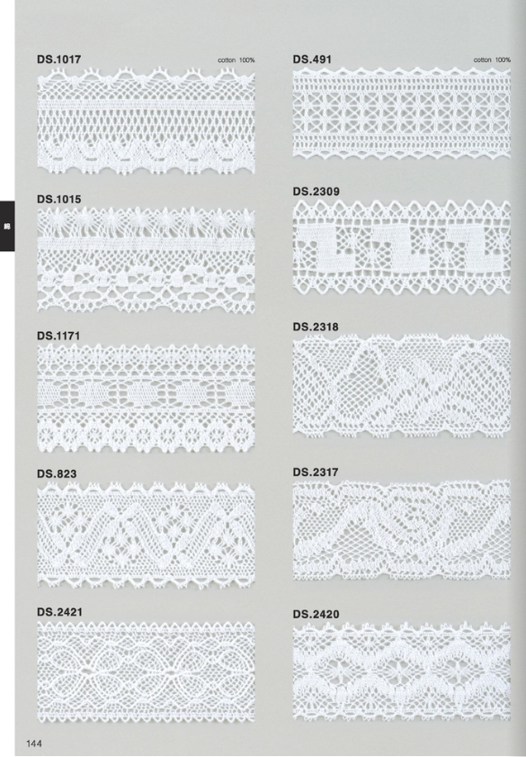 〇シルケット加工済の綿糸を使用したトーションレースで、繊細に編み込んでおります。
